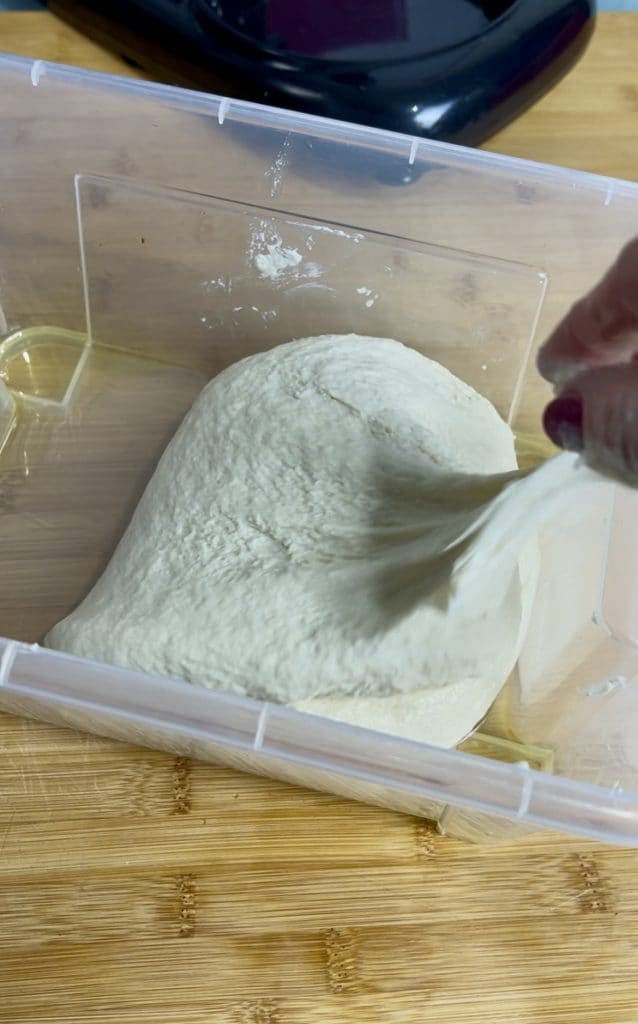 Übertragen wir ihn dann in einen leicht geölten Behälter und falten wir ihn mit den Händen ein paar Mal, um ihn zu stärken. Decken wir den Behälter und lassen wir den Teig etwa eine Stunde ruhen.