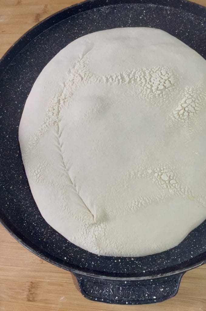 An diesem Punkt rollen wir den Teig vorsichtig mit einem Teigschaber ein, um zu vermeiden, dass er an der Arbeitsfläche klebt.