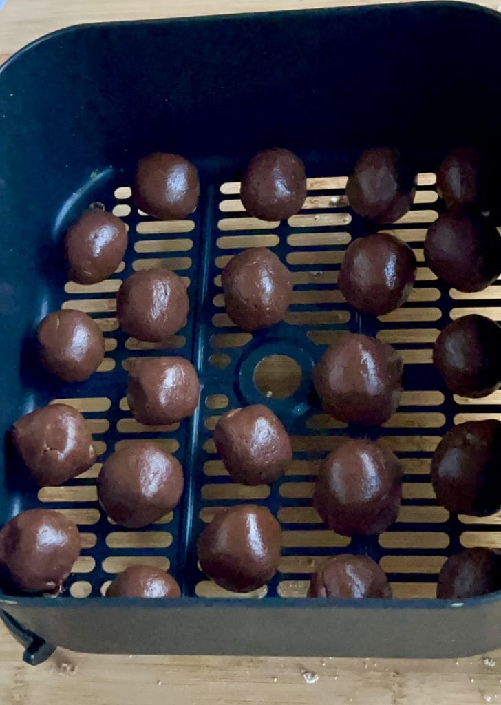 Wir rollen sie zwischen den Handflächen zu Kugeln und platzieren sie direkt auf dem Rost der Heißluftfritteuse.
