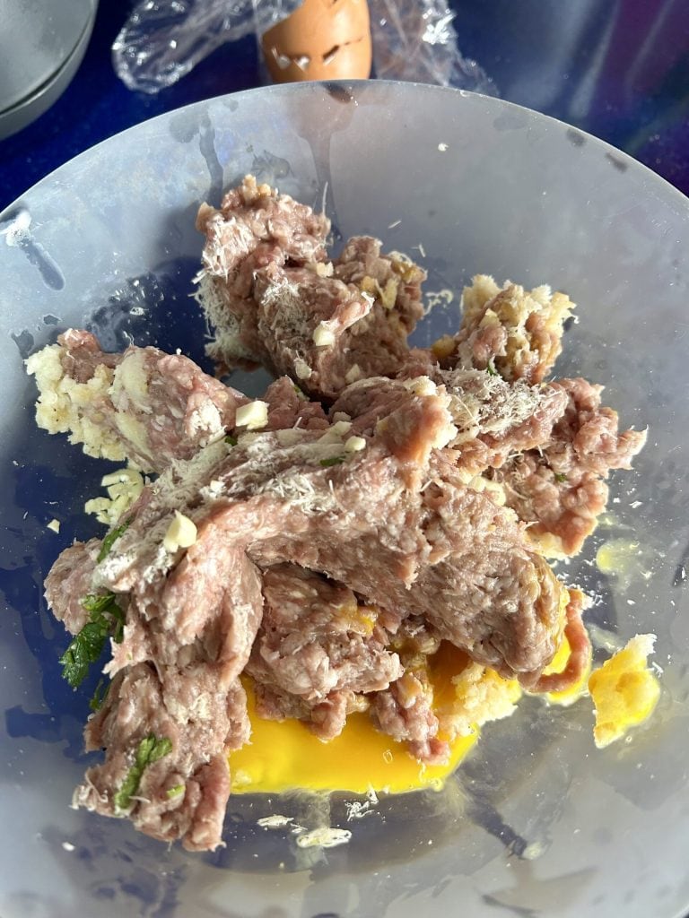 Zuerst kümmern wir uns um den Teig. In einer großen Schüssel das altbackene Brot zerbrechen, nachdem es unter fließendem Wasser getränkt und gut ausgedrückt wurde. Das Hackfleisch, eine Prise Salz, eine Prise Pfeffer, den geriebenen Parmesan, die gehackte Petersilie, den gehackten Knoblauch und ein ganzes Ei hinzufügen.