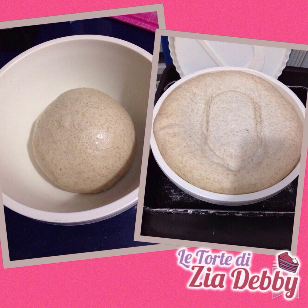 Ich begann damit, den Sauerteig in 200 ml lauwarmem Wasser für etwa 10 Minuten aufzulösen (die anderen 50 ml habe ich zurückgehalten, um den Teig zu korrigieren, wenn er zu hart war, und da ich Vollkornmehl verwendet habe, benötigte ich ihn, aber wenn man nur Weißmehl verwendet, könnte es nicht notwendig sein). Nach dieser Zeit habe ich das Mehl in die Küchenmaschine gegeben, dann das Wasser mit dem Sauerteig hinzugefügt und angefangen, mit mittlerer Geschwindigkeit zu kneten. Als der Teig Form annahm, habe ich den Honig und das Öl hinzugefügt, schließlich das Salz, und ließ kneten, bis ein kompakter und glatter Teig entstanden war. An diesem Punkt habe ich eine Kugel geformt, die ich in einen Behälter legte und mit etwas Öl bestrich, um eine Kruste an der Oberfläche zu verhindern. Ich habe den Behälter mit einem Deckel abgedeckt und für etwa 8 Stunden in den ausgeschalteten Ofen zum Ruhen gestellt. Ich habe abends geknetet und heute Morgen um 6:30 Uhr fand ich den Teig, der den Deckel erreicht hatte.
