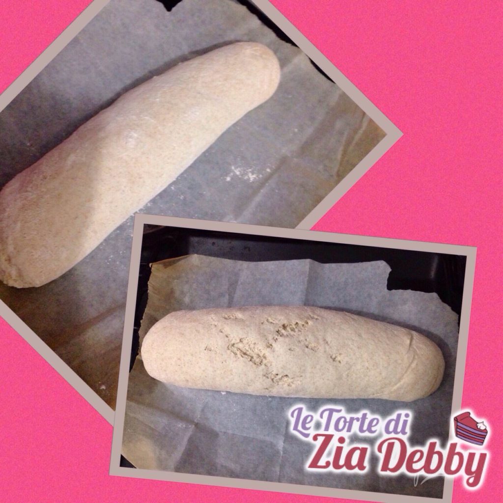 Ich nahm den Teig wieder auf, legte ihn auf eine bemehlte Arbeitsfläche und rollte ihn, ohne ihn zu fest zu wickeln, auf sich selbst auf, legte ihn dann auf ein mit Backpapier ausgelegtes Backblech und ließ ihn noch etwa zwei Stunden im ausgeschalteten Ofen ruhen, ebenfalls mit Folie bedeckt. Auf dem zweiten Foto sieht man, wie ich es verschwommen fand.