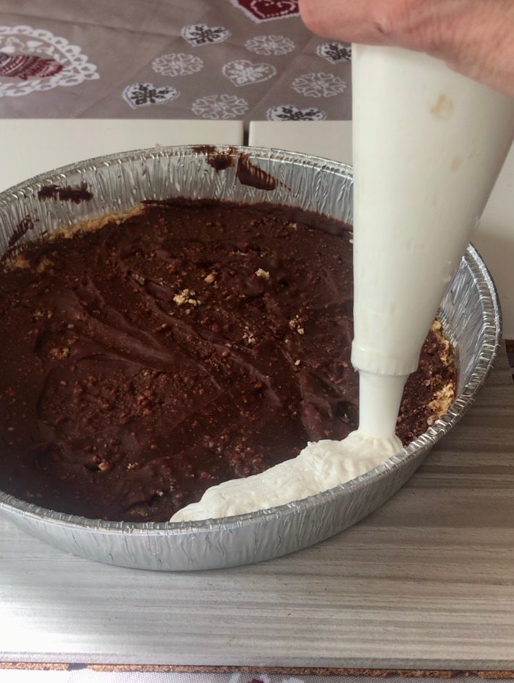 Im Internet gibt es verschiedene Versionen dieser Torte, aber nachdem ich einige ausprobiert hatte, fand ich meine perfekte Dosis: ein Keks, der nicht zu hoch ist, und eine reichlichere Creme mit geschmolzener Schokolade und gehackten Haselnüssen, die wirklich an das Herz aus Sahne erinnern.