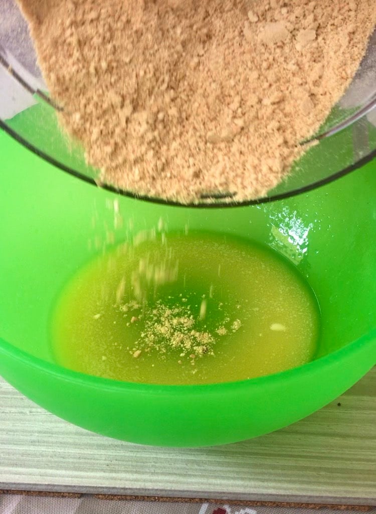 Die Basis sind gemahlene Kekse, die mit geschmolzener Butter vermischt werden.