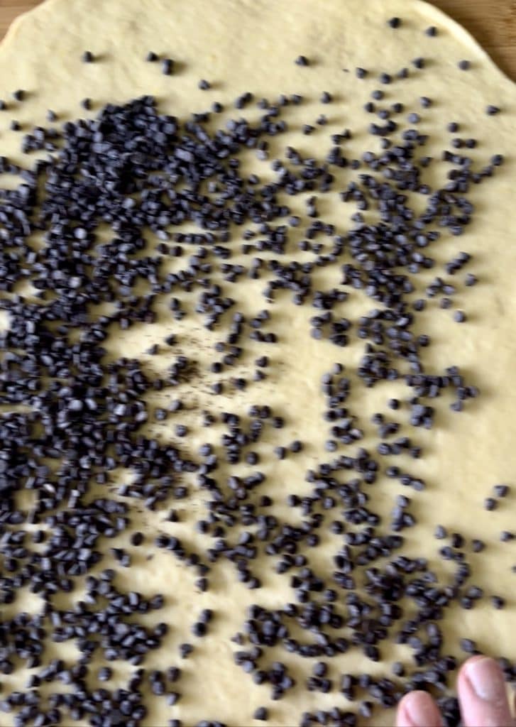 Jetzt ist es an der Zeit, unseren Engelszopf zu füllen. Ich habe auf das Rechteck nur die Schokoladenstückchen gestreut, aber wie bereits erwähnt können Sie auch die Buttercreme vorbereiten und auf das gesamte Rechteck streichen und dann die Stückchen und eventuell etwas Nüsse hinzufügen.