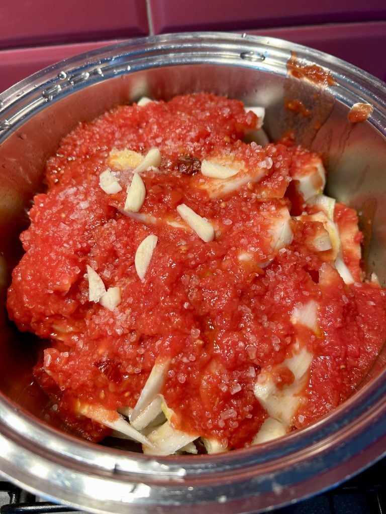Fügen Sie zum Fenchel im Topf Salz, Peperoncino, gehackten Knoblauch, Öl, Wasser und Tomaten hinzu. Mit dem Deckel abdecken und auf hoher Hitze zum Kochen bringen, dann die Hitze leicht reduzieren und etwa 30 Minuten kochen lassen.