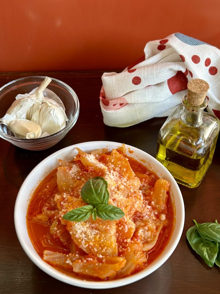 Der Fenchel gart langsam in den Tomaten und sein Geschmack wird durch Basilikum oder Petersilie verstärkt, die wir hinzufügen, zusammen mit dem kräftigen Pecorino, der immer im Topf gekocht und vor dem Servieren auf das Gericht gestreut wird.