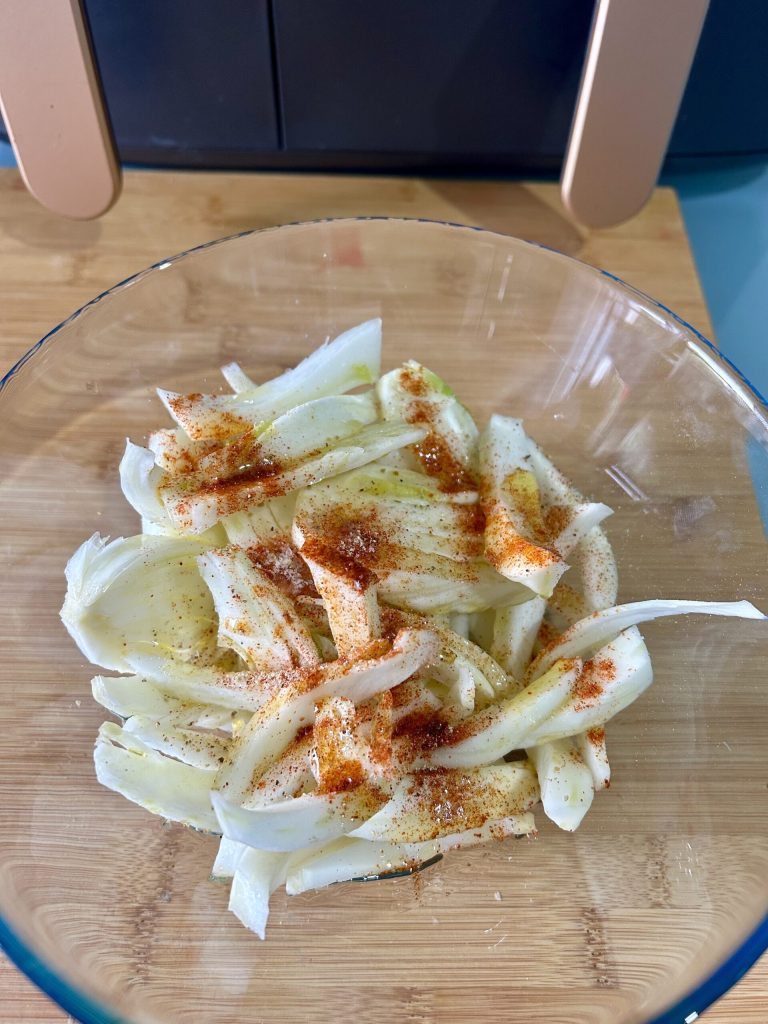 Entferne die äußeren Blätter des Fenchels, die härteren, und schneide ihn in dünne Scheiben. Wasche ihn gründlich unter fließendem Wasser und gib ihn in eine Schüssel. Füge Salz, Pfeffer, eine Prise Ingwer, etwas edelsüße Paprika und einen Schuss Olivenöl hinzu und mische alles gut.