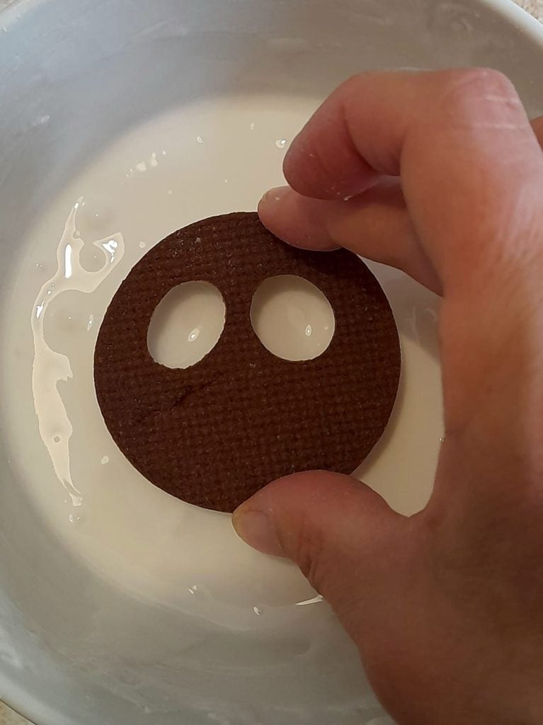 Wir müssen eine ziemlich flüssige Konsistenz erzielen, damit die Kekse leicht in die Schale getaucht werden können.