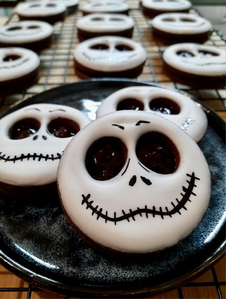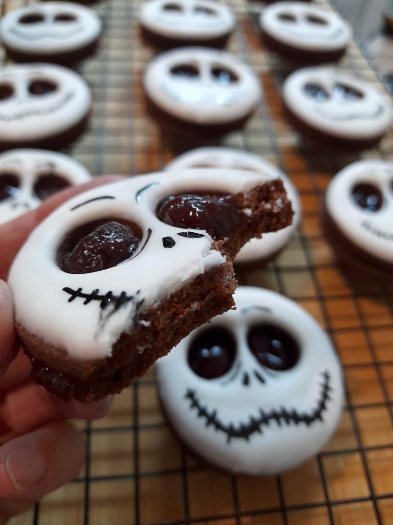 Sicher! Wenn du möchtest, kannst du die Marmelade durch Haselnusscreme, Schokoladenganache oder Orangenmarmelade ersetzen: Jede Variante verleiht deinen gruseligen Keksen eine spezielle Note.