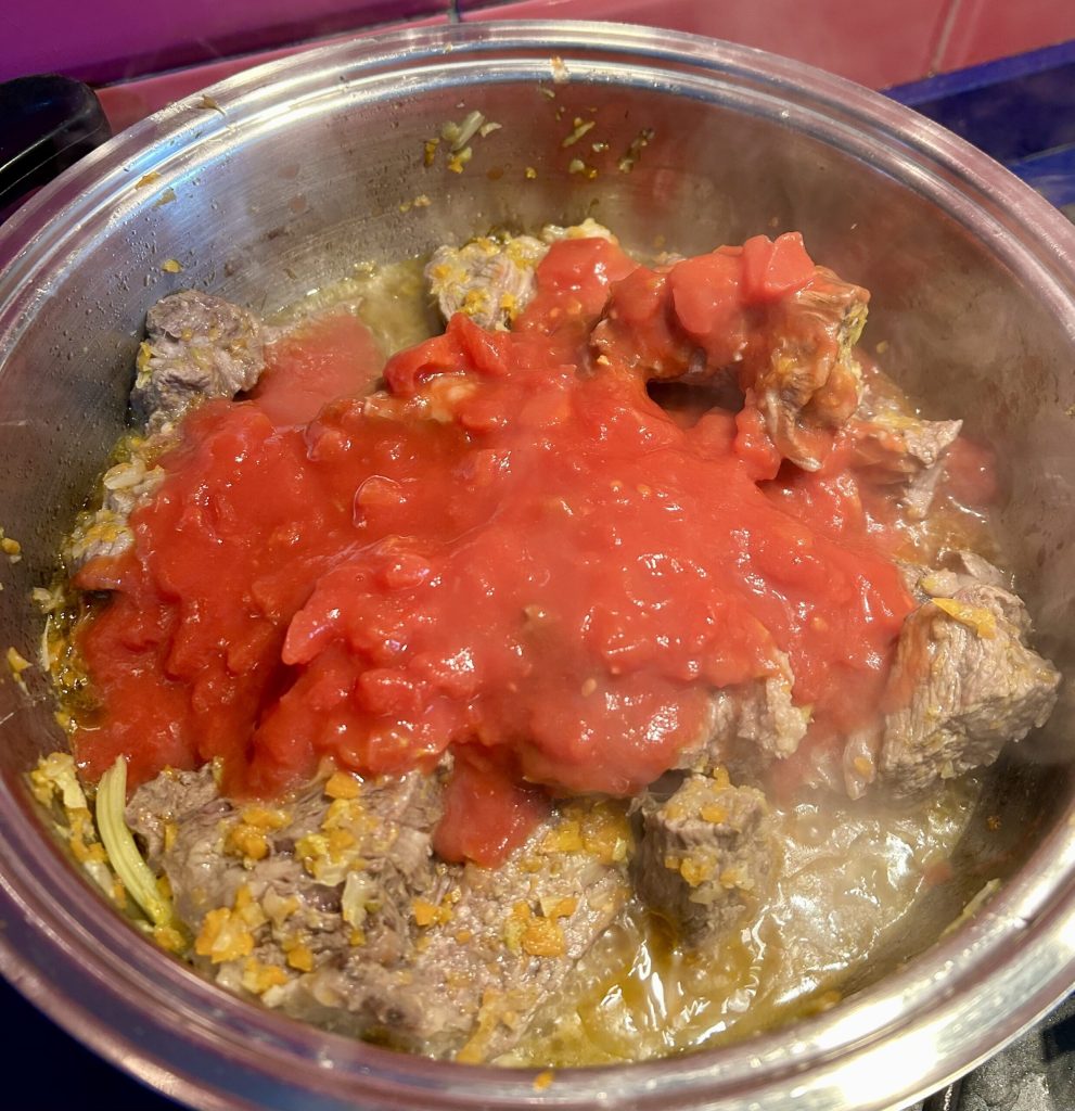 Das Gulasch zum Gemüse geben und gut von allen Seiten anbraten, dabei häufig umrühren. Mit Weißwein ablöschen und den Alkohol verdampfen lassen. Dann die Tomate hinzufügen, umrühren und mit Salz abschmecken.