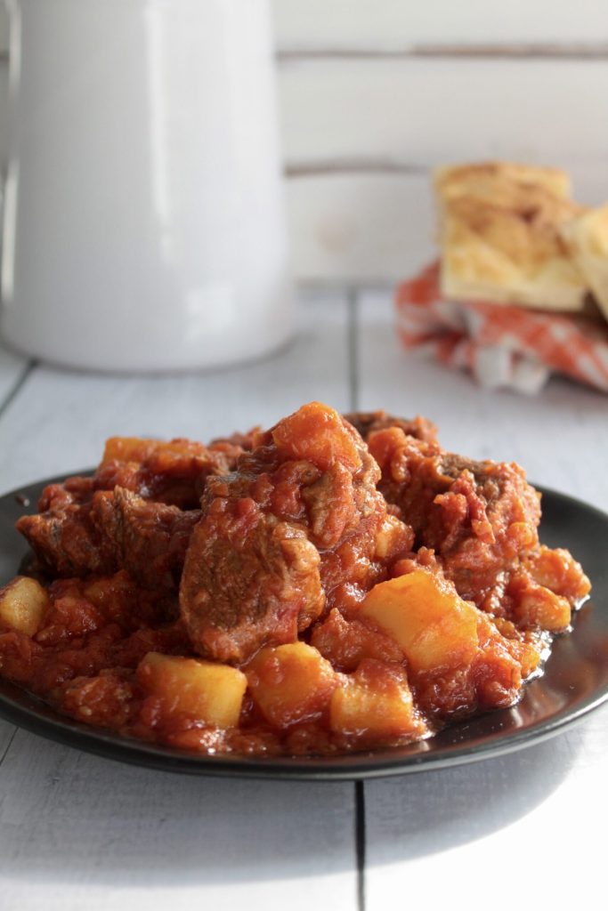 Dieser Gulasch mit Soße und Kartoffeln schmeckt wirklich nach einem Sonntag mit der Familie, nach warmem Brot und Soße, die zum Dippen einlädt.