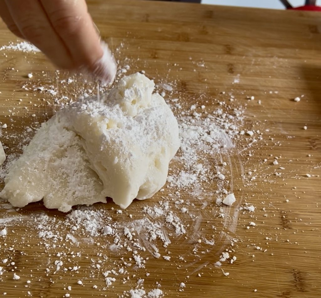 Übertragen Sie den Teig auf eine leicht mit Maisstärke bestäubte Arbeitsfläche und kneten Sie ihn mit den Händen, bis er nicht mehr klebrig ist. Er ist fertig, wenn er beim Berühren mit einem Finger nicht an diesem haften bleibt.