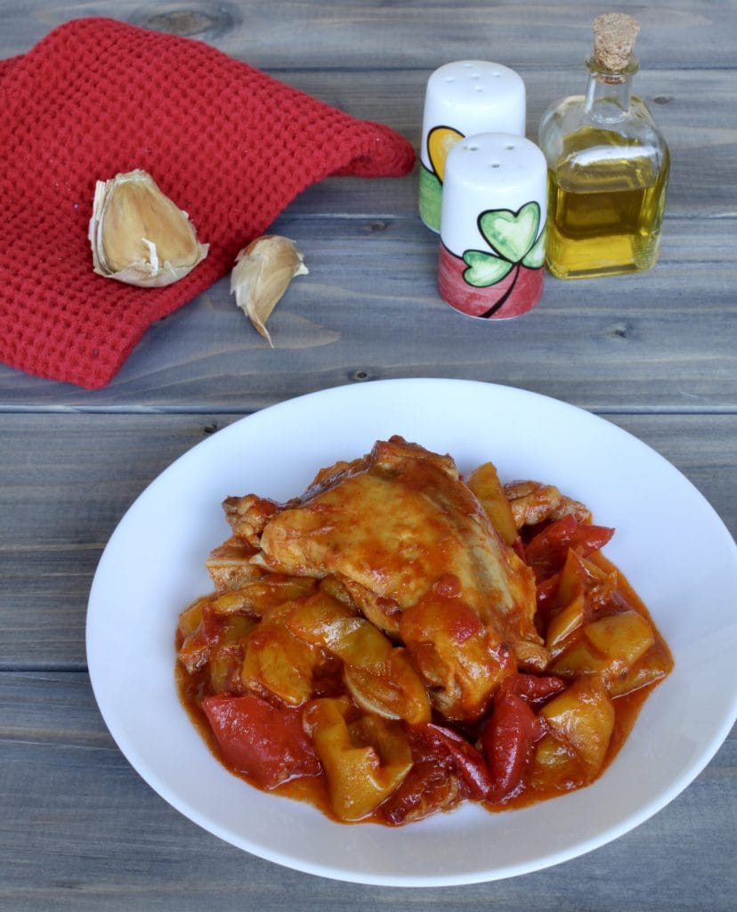 Ich folge dem Rezept meiner Mutter, das meine Gäste immer begeistert. Ich ersetze die Zwiebel durch Knoblauch und verwende keinen Oregano, sondern nur Petersilie und, wenn frisch, ein paar Basilikumblätter. Pfeffer und Peperoncino dürfen nie fehlen, aber ohne zu übertreiben, um die anderen Aromen nicht zu überdecken. Wie immer empfehle ich, das Rezept an euren Geschmack und die verfügbaren Zutaten anzupassen. Verzichten Sie nie auf ein so schmackhaftes Gericht nur wegen eines fehlenden Zutaten! Jedes Rezept hat Variationen, zum Beispiel gibt es Leute, die dem Huhn mit Paprika Kapern und schwarze Oliven hinzufügen, was es noch schmackhafter macht.