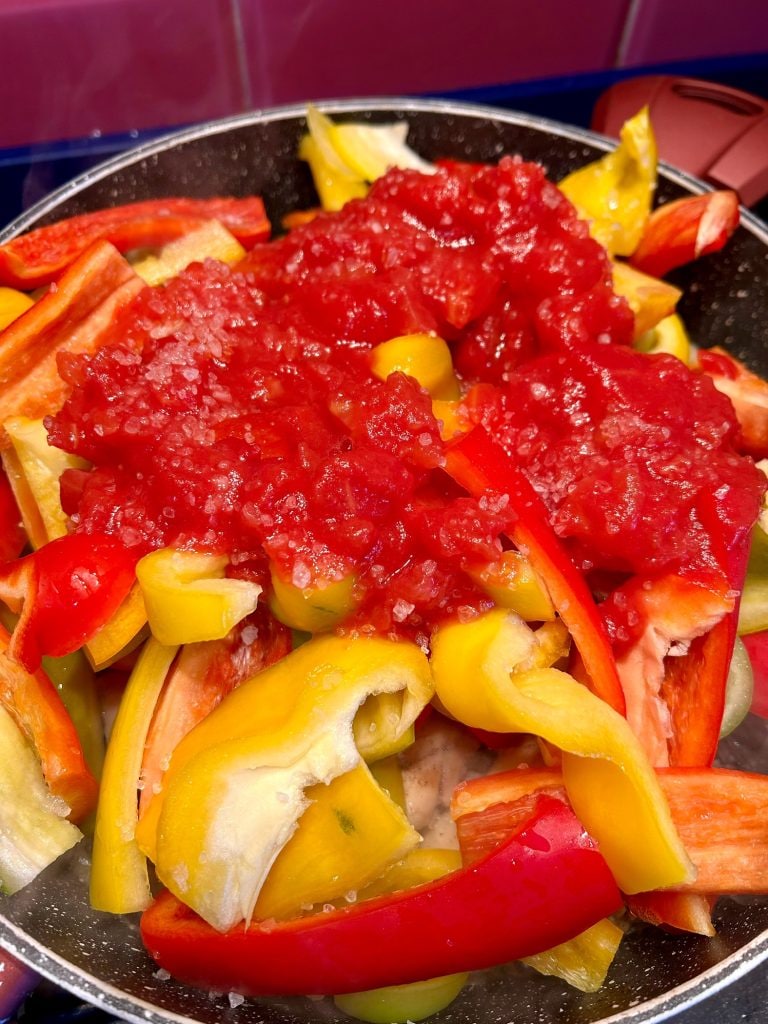 Sobald der Wein verdampft ist, die geschnittenen Paprika, das Tomatenmark, etwas grobkörniges Salz und Peperoncino nach Belieben hinzufügen, dann alles mit geschlossenem Deckel kochen lassen.