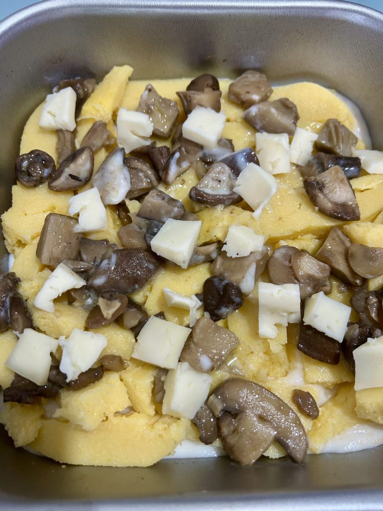 • Etwas Béchamel auf den Boden der Backform gießen. Mit einer Schicht geschnittener Polenta bedecken, einen Teil der Pilze und einige Stücke Käse darauf verteilen. Weitere Béchamel hinzufügen und mit einer zweiten Schicht Polenta, Pilzen und Käse fortfahren.