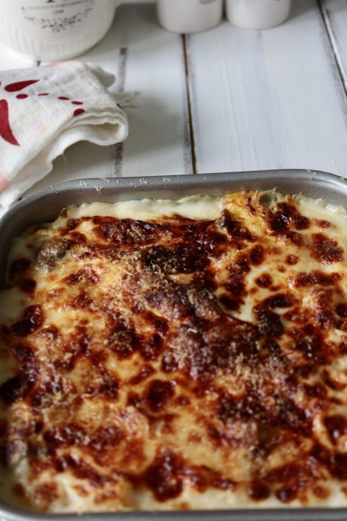 • Die letzte Schicht mit der restlichen Béchamel bedecken und mit einer großzügigen Prise geriebenem Parmesan abschließen.