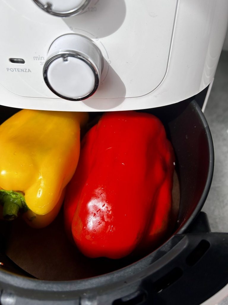 In der Heißluftfritteuse geröstete Paprika, eine großartige Alternative zum Backen im Ofen, sie werden gleichmäßig gegart und lassen sich sehr leicht schälen. In einer halben Stunde haben wir fantastische Paprika, die ihre innere Struktur intakt halten, sodass sie leicht von ihrer Haut und überschüssigen Samen gereinigt werden können und so leicht verdaulich werden.
