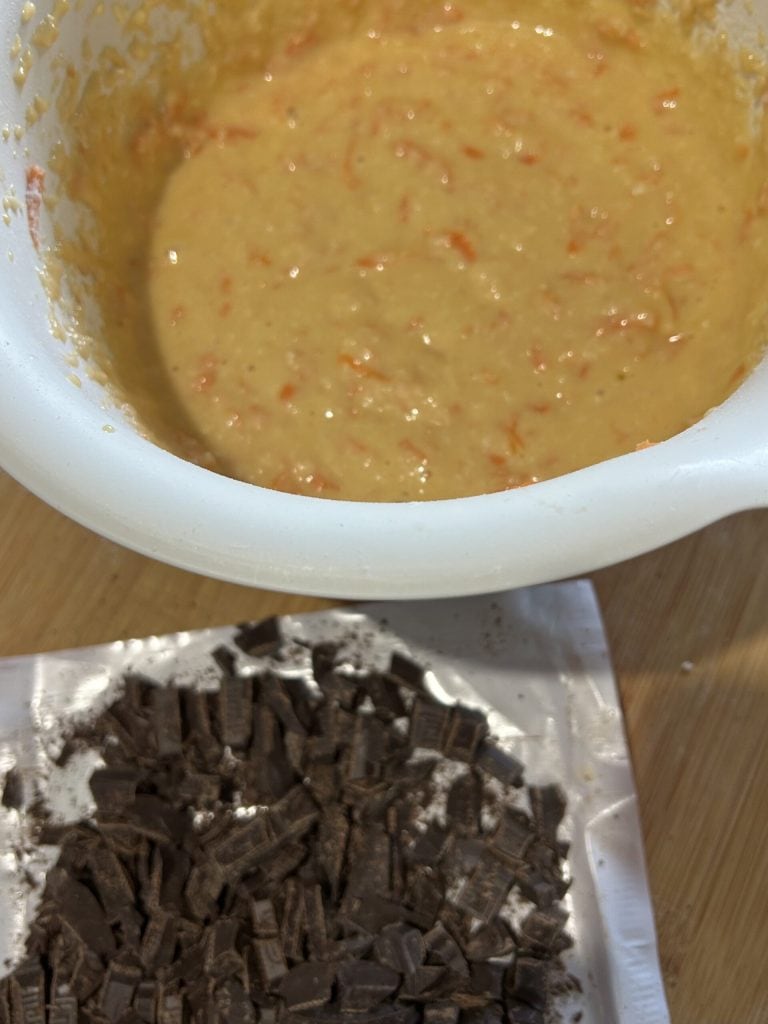 Fügen Sie jetzt schrittweise die restlichen Zutaten hinzu, in der Reihenfolge, wie sie in der Liste angegeben sind: Mehl, Kokosmehl, geraspelte Karotten, Milch und Öl. Das Backpulver wird zuletzt eingearbeitet, während die zerkleinerte Schokolade erst auf der Oberfläche hinzugefügt wird.