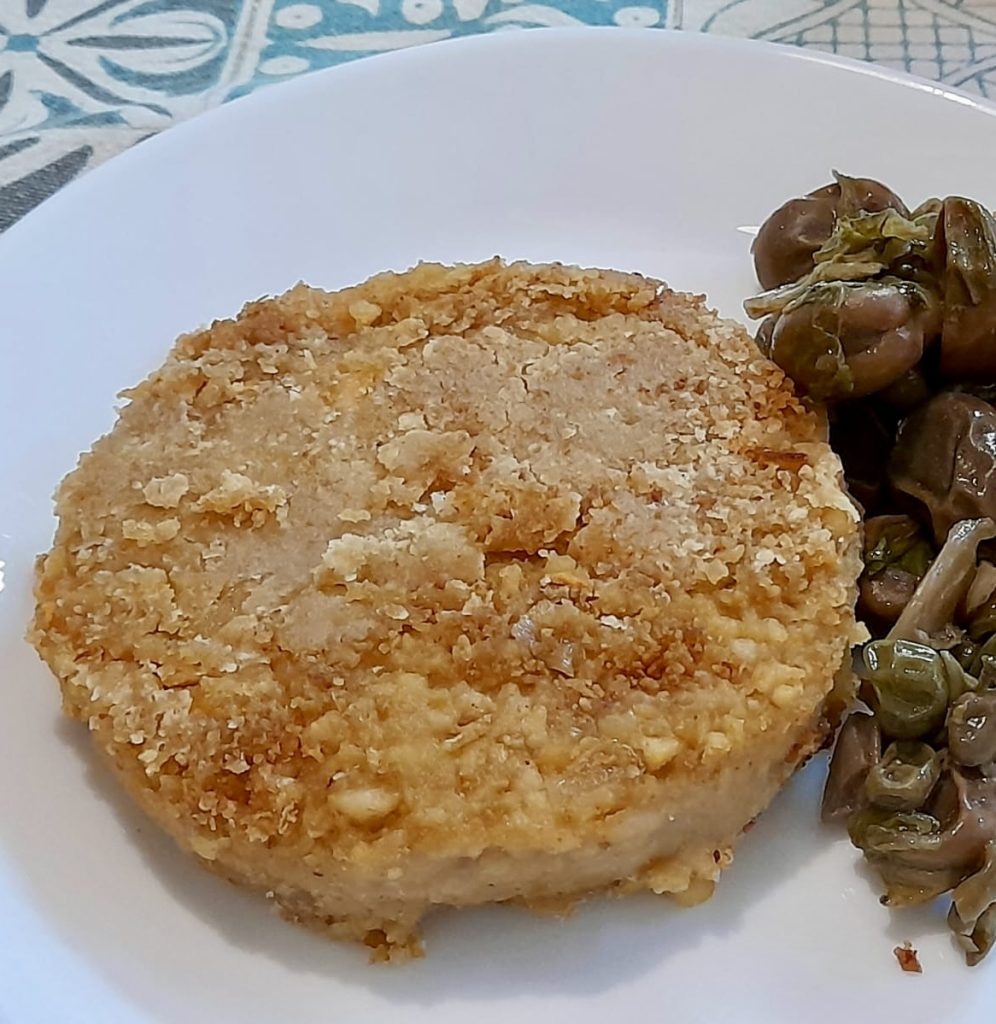 Sobald die Gemüsebasis fertig ist, fahren Sie mit der Zubereitung des Teigs fort. Pürieren Sie die Kichererbsen mit einer Küchenmaschine, bis eine homogene Masse entsteht. Ich empfehle, die Kichererbsen gut zu pürieren, aber nicht zu übertreiben, da kleine Stücke eine interessantere Textur im Teig ergeben. Fügen Sie dann die Gemüsebasis, einen Esslöffel Sojasauce und die Semmelbrösel (oder, wenn Sie es vorziehen, das Kichererbsenmehl) hinzu und mischen Sie gut, bis ein kompakter und gut durchmischter Teig entsteht.