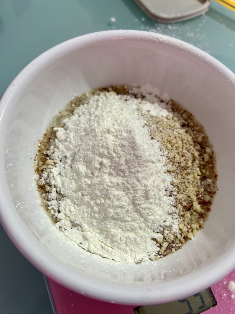 Bereiten Sie die Glasur vor, indem Sie in einer kleinen Schüssel Eiweiß, Zucker, Mandelmehl und Maisstärke zusammengeben.