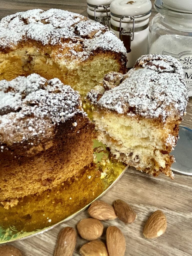 Den Teig in die Form geben, OHNE sie zu fetten oder zu mehlen. Geben Sie die Glasur mit einem Spritzbeutel oder von Hand auf die Teigoberfläche. Decken Sie mit den Mandeln ab, indem Sie versuchen, sie entlang der gesamten Oberfläche zu verteilen, und backen Sie im vorgeheizten Ofen bei 160°C für 40 Minuten, ohne den Ofen zu öffnen. Dann die Temperatur auf 180°C erhöhen und weitere 10 Minuten backen. Insgesamt benötigt es 50 Minuten Backzeit, aber machen Sie immer den Stäbchentest, bevor Sie es aus dem Ofen nehmen.