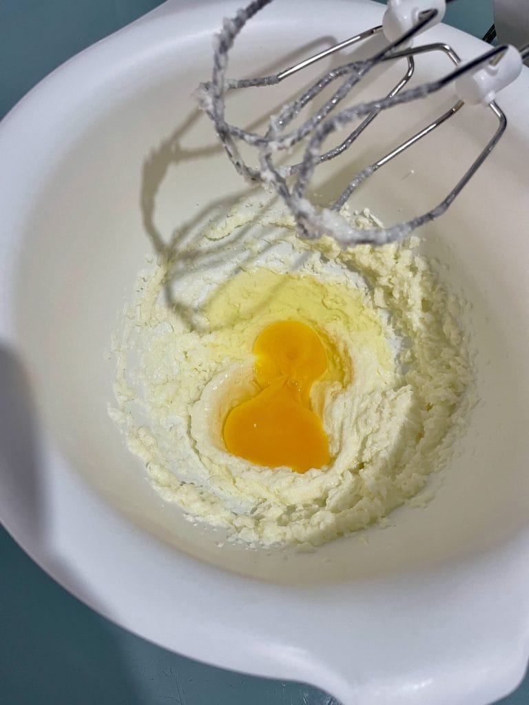 Der Teig dieses Kuchens beginnt mit weicher Butter, die mit Zucker aufgeschlagen wird. Mischen Sie sie gut, um sie homogen und cremig zu machen. Fügen Sie dann während des Mischens mit den elektrischen Schneebesen ein Ei nach dem anderen hinzu, wobei Sie warten, bis das vorherige Ei in den Teig aufgenommen wurde, bevor Sie das nächste hinzufügen.