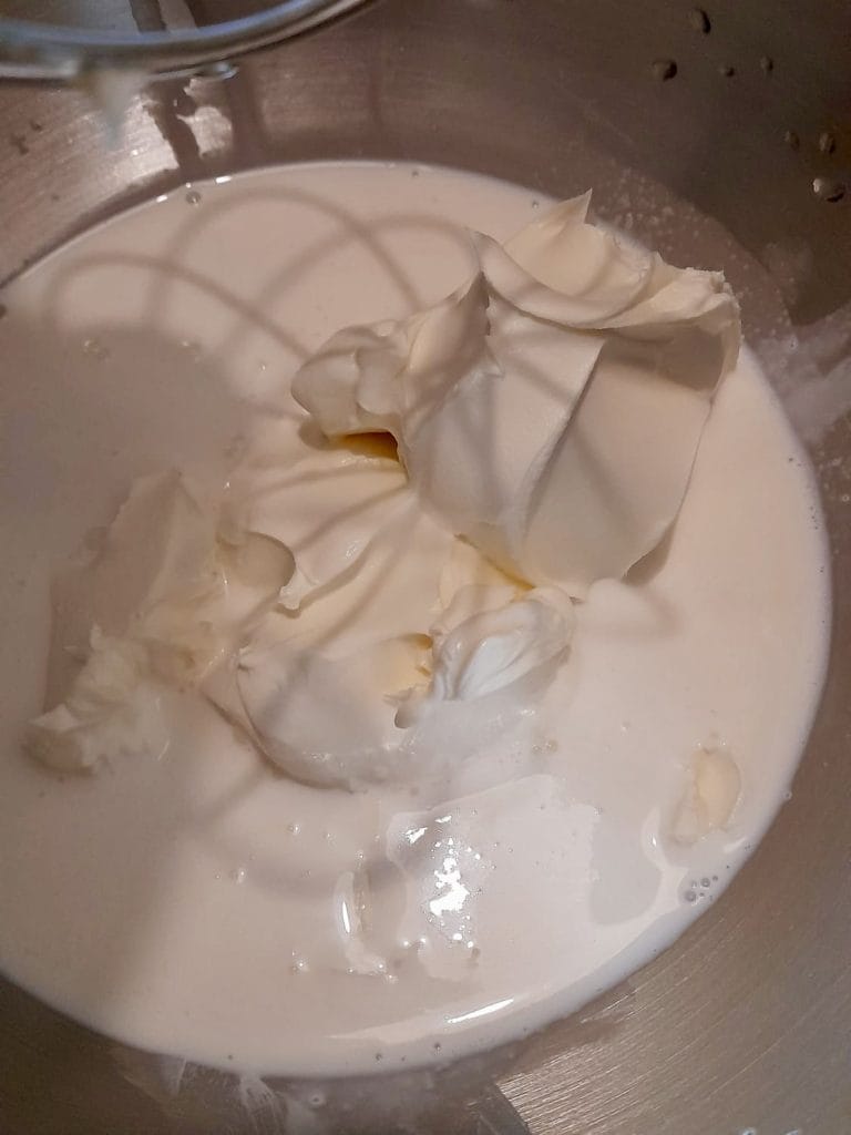 Geben Sie in die Schüssel der Küchenmaschine die Sahne und den Mascarpone. Beginnen Sie, sie vorsichtig zu mischen, um Spritzer zu vermeiden, dann erhöhen Sie die Geschwindigkeit, um sie gut zu schlagen, bis Sie eine weiche und gut geschlagene Masse erhalten.