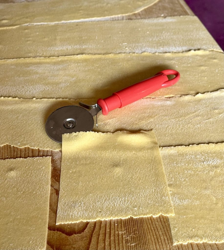 Wenn Sie alle Ihre Teigblätter in der gewünschten Dicke erneut ausgerollt haben, schneiden Sie sie mit einem Pizzaschneider oder einem Messer in viele Rechtecke, die mindestens 10 cm hoch sind. Dieser erhaltene Teig kann im Kühlschrank für 2 oder 3 Tage aufbewahrt werden, solange Sie ihn mit Frischhaltefolie abdecken, damit er nicht austrocknet.