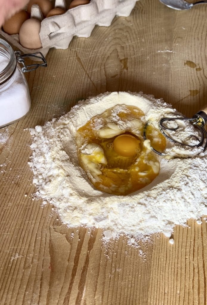 Mit kreisenden Bewegungen, unterstützt von einer Gabel oder einem Handschneebesen, lassen Sie das Mehl nach und nach von den Eiern aufnehmen, dann kneten Sie mit den Händen weiter, um den Teigball zu erhalten. Der erhaltene Teig kann sofort ohne Ruhezeit verwendet werden.