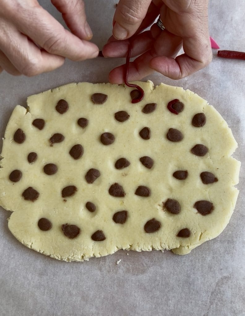 Wir haben ihn dann in drei Farben geteilt: ein Teil mit Kakaopulver, ein Teil mit etwas rotem Farbstoff, und für einige Kekse haben wir dünne Streifen aus schwarzem Fondant hinzugefügt, um einen noch originelleren Leoparden-Effekt zu erzielen.
