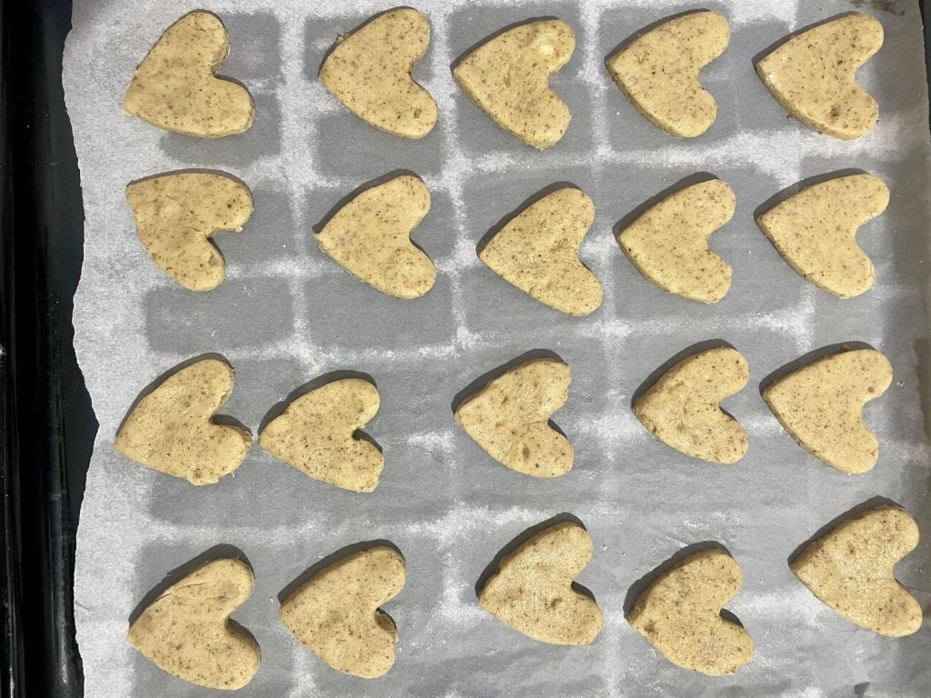 Aus diesem Teigblatt haben wir mit einem herzförmigen Ausstecher unsere Kekse ausgeschnitten und auf drei mit Backpapier ausgelegte Backbleche gelegt. Die Kekse ein wenig voneinander entfernt platzieren, da sie beim Backen aufgehen. Im vorgeheizten Backofen bei 180° für etwa 12 Minuten backen, darauf achten, dass sie schön goldbraun, aber nicht zu dunkel sind. Wenn Sie die Kekse aus dem Ofen nehmen, sind sie sehr weich, also lassen Sie sie abkühlen, bevor Sie sie anfassen. Beim Abkühlen werden sie knusprig.