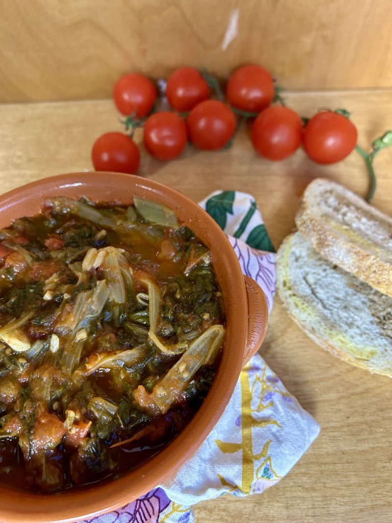 Mangold mit Tomate, eines meiner Lieblingsbeilagen, das in einigen Regionen mit geröstetem oder frittiertem Brot als Hauptgericht serviert wird. Denn es handelt sich um ein sehr saftiges Gericht, da die frische Tomate direkt im Topf mit dem Mangold gekocht wird und ihre Aromen perfekt vermischt. Der Geschmack wird durch die Zugabe von Knoblauch und Peperoncino verbessert und verstärkt, was dieses Gericht lebendig macht und ideal als Begleitung zu Hauptgerichten. Seine lebendige Zusammensetzung sowohl geschmacklich als auch visuell, dank seiner kontrastierenden und kräftigen Farben, macht es perfekt für hervorragende Aperitifs, serviert auf Bruschetta oder Polenta.