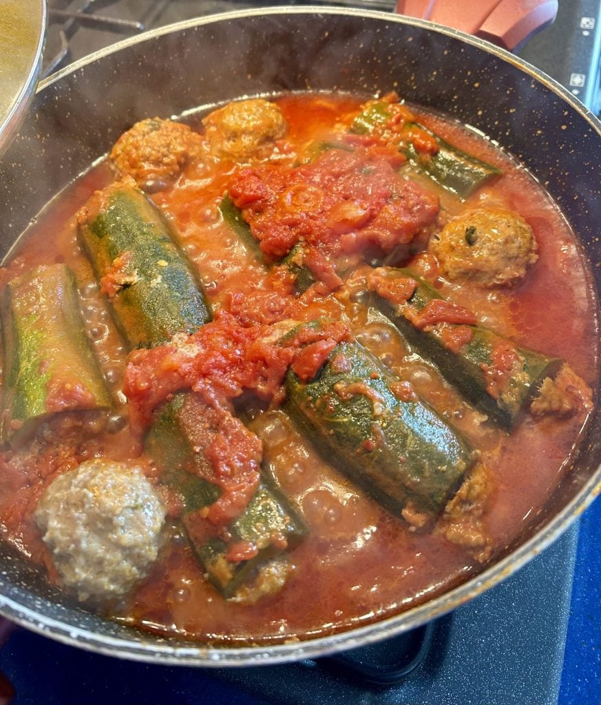 Sobald die Zucchini gefüllt sind, legen wir sie direkt in eine große Pfanne. Nachdem alle fertig sind, gießen wir das Tomatenfruchtfleisch hinzu, fügen etwas Wasser hinzu, würzen mit Salz, geben eine Prise Chilischote hinzu und einen Faden extra natives Olivenöl. Abdecken und auf das Feuer stellen. Bei starker Hitze zum Kochen bringen, dann die Hitze leicht reduzieren und etwa 30 Minuten kochen lassen.