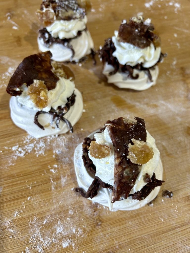 Die Zubereitung des Mont Blanc ist wirklich einfach: Man muss die Baiser mit Kastanienteigspitzen bedecken, etwas Schlagsahne hinzufügen und mit Stücken von kandierten Kastanien dekorieren.