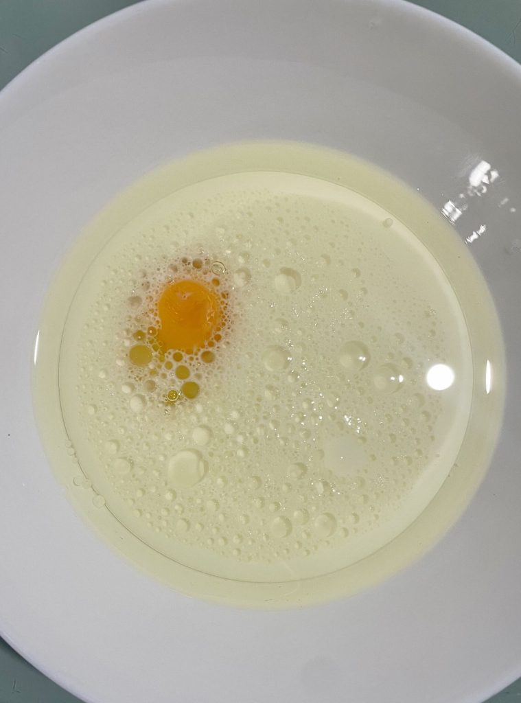 • In einer anderen Schüssel mischen wir die flüssigen Zutaten: das Ei, das Pflanzenöl und die Milch.