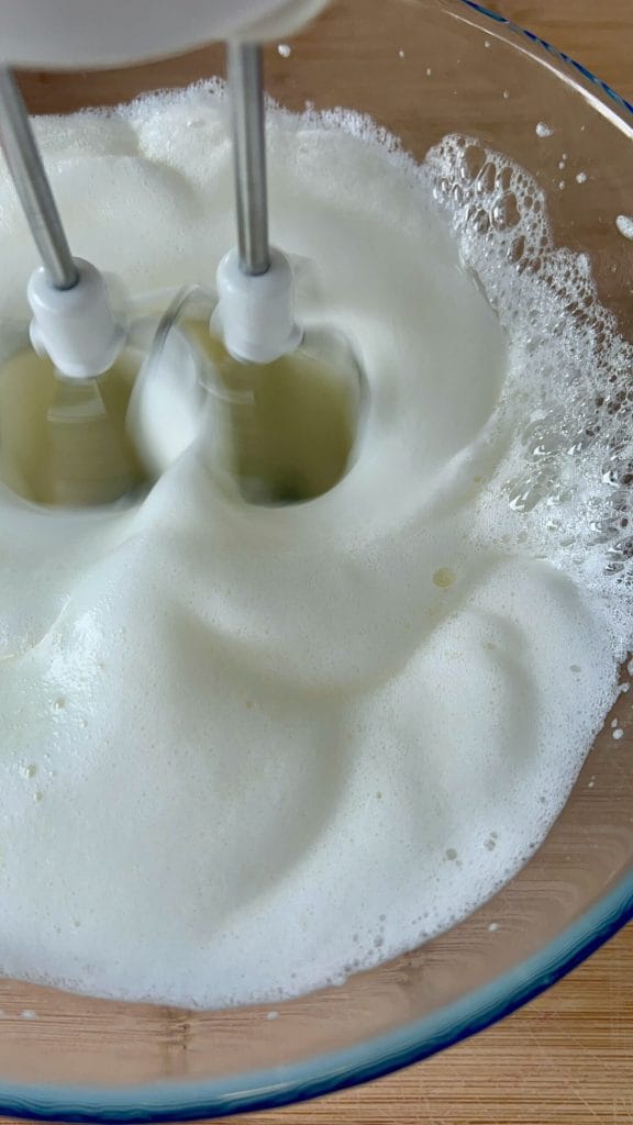 • Gib die Eiweiße in eine große Schüssel und schlage sie mit einem elektrischen Schneebesen zu steifem Schnee. Du kannst auch die Küchenmaschine verwenden, um die Arbeit zu erleichtern, aber ich empfehle nicht, sie von Hand zu schlagen, da dies zu viel Zeit und Energie erfordern würde.