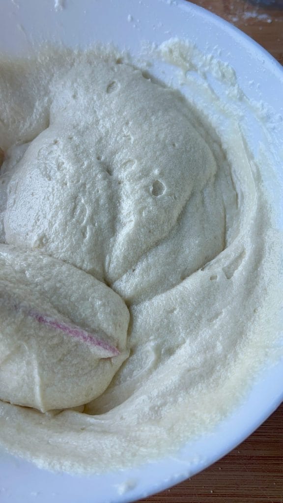 • Füge die geschlagenen Eiweiße zur Butter-, Zucker-, Limoncello-Creme-, Mehl- und Backpulvermischung hinzu. Hebe sie von Hand unter, nicht mit dem elektrischen Schneebesen, um zu vermeiden, dass sie zusammenfallen. Verwende einen Spatel oder einen Handbesen und mische mit sanften Bewegungen von unten nach oben. Ich empfehle, die Eiweiße in zwei Schritten hinzuzufügen: Der erste macht den Teig flüssiger, der zweite ermöglicht es, alles leichter zu vermengen, bis eine homogene Konsistenz erreicht ist.
