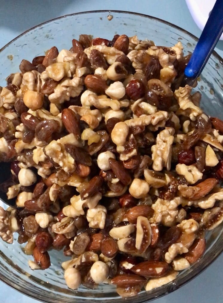 Gießen Sie die Rosinen aus dem Wasser ab, geben Sie sie zusammen mit den anderen Zutaten in die Schüssel, fügen Sie Marmelade und Honig hinzu und mischen Sie gut mit zwei Löffeln. Alle Zutaten müssen gut vermengt sein.