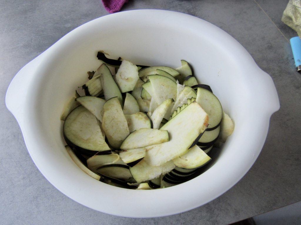 Waschen Sie die Auberginen gründlich und entfernen Sie den Stiel, schneiden Sie sie sehr fein, ich persönlich habe die Küchenmaschine verwendet. Sie müssen nicht ruhen, Sie können sie sofort nach dem Schneiden verwenden.