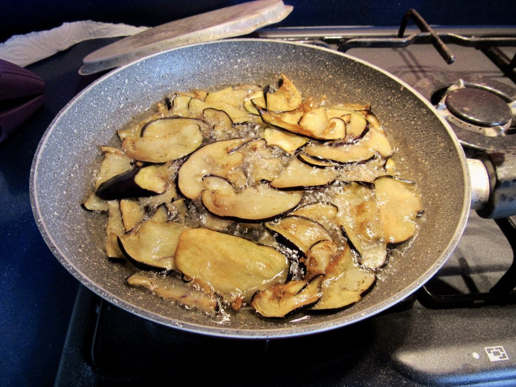 Geben Sie das Pflanzenöl in eine große Pfanne und erhitzen Sie es auf Frittiertemperatur. Um zu prüfen, ob das Öl heiß ist, tauchen Sie die Spitze eines Zahnstochers ein; wenn sich Blasen bilden, ist das Öl bereit zum Frittieren. Frittieren Sie alle Auberginen, das dauert nur wenige Minuten, ich habe sie in zwei Portionen aufgeteilt, lassen Sie sie auf Küchenpapier abtropfen und legen Sie sie beiseite.