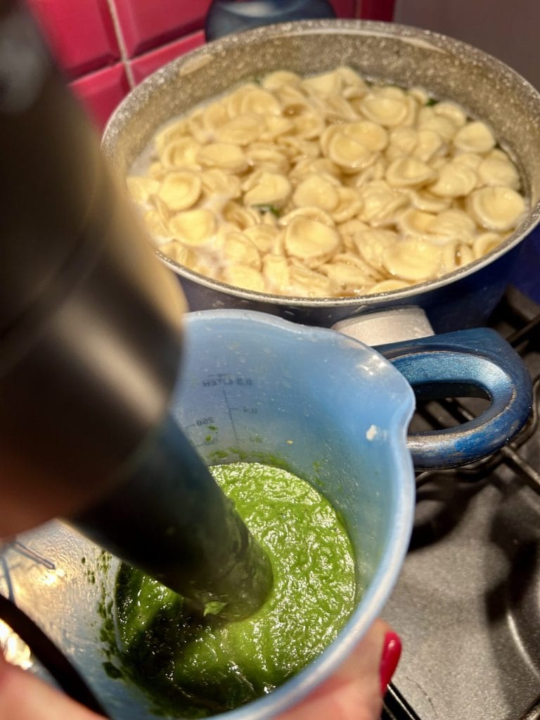 Geben Sie die Pasta in das kochende Wasser und kochen Sie sie nach den Angaben auf der Packung für al dente. Während die Pasta kocht, pürieren Sie mit einem Mixer die in der Pfanne gebratene Rucola mit all ihren Zutaten. Pürieren Sie alles gut und geben Sie es in die Pfanne außerhalb des Feuers zurück, um es nicht weiter einziehen zu lassen.