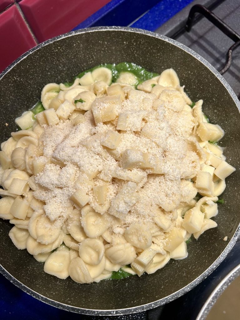 Wenn die Pasta al dente ist, bringen Sie die Pfanne mit der pürierten Rucola zurück auf den Herd, geben Sie die abgegossene Pasta hinzu, jedoch noch mit etwas Kochflüssigkeit, fügen Sie die Fontina-Würfel, den geriebenen Parmesan hinzu und mischen Sie alles, bis die Fontina gut schmilzt und das Dressing gleichmäßig wird und die gesamte Pasta bedeckt.