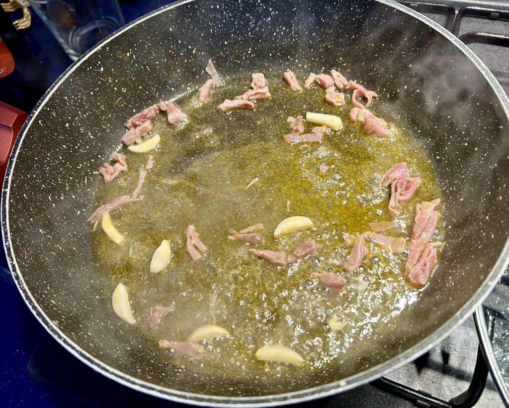 Die Sauce wird wirklich in der Zeit zubereitet, die das Wasser benötigt, um zum Kochen zu kommen, um die Pasta zu kochen, daher empfehle ich, immer eine Packung Sahne, Tabasco und Wodka im Haus zu haben. Das sind Zutaten, die sich lange im Vorratsschrank halten und immer einen guten Eindruck machen. Der Knoblauch sollte in große Stücke geschnitten und nach dem Anbraten entfernt werden, aber ich lasse ihn manchmal drin, da er gut sichtbar ist und von denen, die ihn nicht mögen, weggeschoben werden kann.