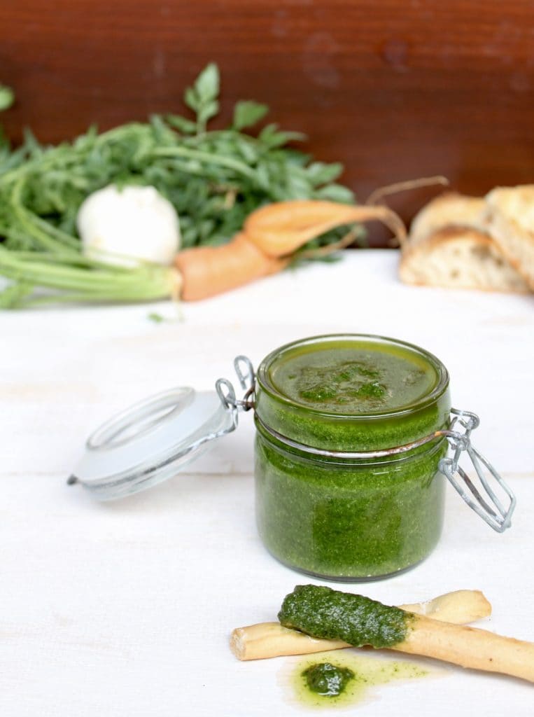 Das so zubereitete Pesto können Sie, falls es nicht sofort verzehrt wird, in Glasbehältern etwa 3 Tage im Kühlschrank aufbewahren, oder es einfrieren und bei Bedarf verwenden, vielleicht in den Wintermonaten, in denen es schwierig ist, frische Karotten mit Grün zu finden.