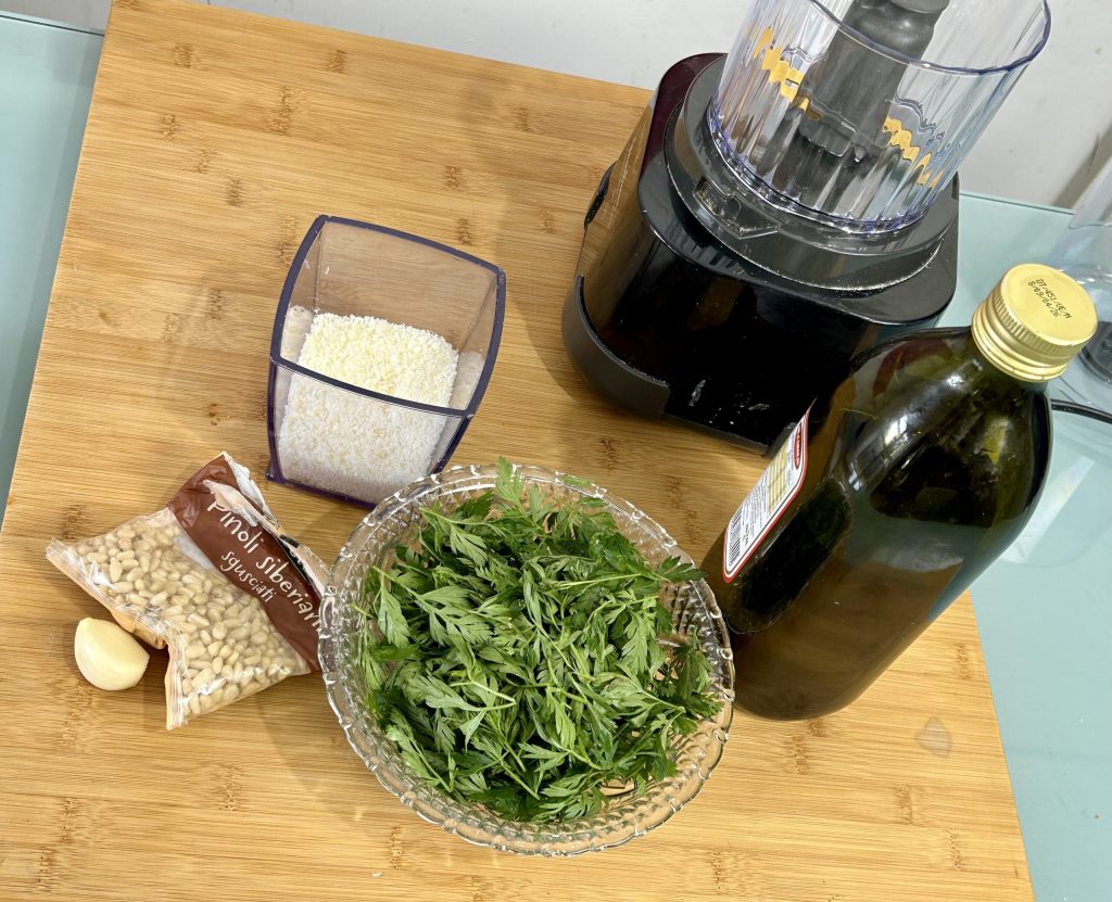 Das Zubereiten des Pestos ist wirklich einfach und schnell, besonders wenn ihr wie ich einen elektrischen Mixer benutzt. Traditionell sollten die Zutaten natürlich von Hand im Mörser zerstoßen werden. Wir verwenden nur den Teil der Blättchen, da die Stängel zu hart sein könnten. Deshalb waschen wir unser Grün gut unter fließendem Wasser und gewinnen etwa 40/50 g Blättchen, um das Pesto für etwa 4 Personen zuzubereiten.