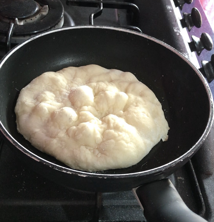 Erhitzen Sie schließlich die Antihaftpfanne gut, drücken Sie jede Kugel mit den Fingern flach, um ein Fladen zu formen, das Sie bei starker Hitze von beiden Seiten backen, wobei Sie darauf achten, es nicht zu verbrennen.