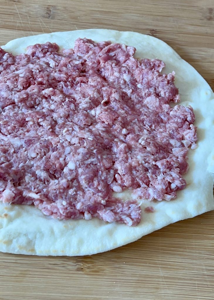 • Nehmen Sie das Hackfleisch und drücken Sie es mit den Händen direkt auf die Piadina, um eine dünne Schicht zu bilden. Würzen Sie mit einer Prise Salz und Pfeffer. Erhitzen Sie eine Grillplatte oder eine antihaftbeschichtete Pfanne gut und legen Sie die Piadina auf die Fleischseite, bis sie gut gebräunt ist.