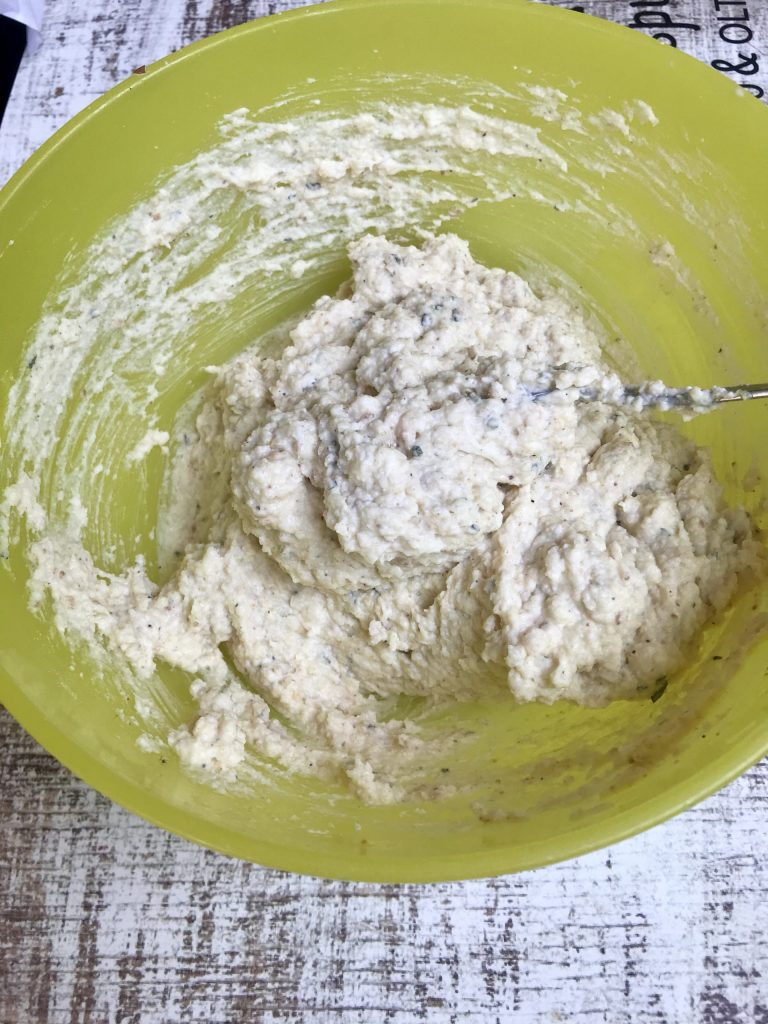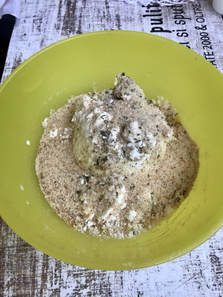 • Alle Zutaten in eine Schüssel geben: Ricotta, Ei, Salz, Pfeffer, Parmesan, Knoblauch und Petersilie in Stücken und Semmelbrösel gut mit einem Löffel vermengen.