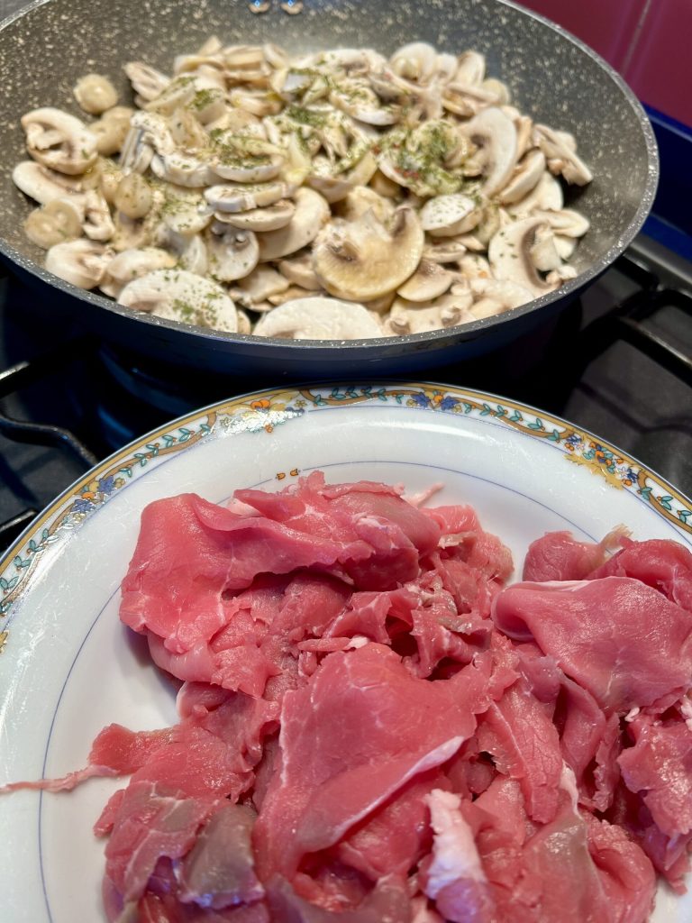 Wenn die Pilze fast gar sind, fügen Sie die in kleine Stücke geschnittenen Rindfleischstreifen hinzu. Wenn die von Ihnen gekauften Streifen dünn, aber nicht schmal sind, zerreißen Sie sie mit den Händen in Stücke. Passen Sie das Salz an und kochen Sie weiter bei mittlerer Hitze mit dem Deckel, um das natürliche Wasser, das sich beim Kochen bildet, nicht zu stark verdunsten zu lassen. Lassen Sie sie etwa 7/8 Minuten kochen, bis die Streifen gar sind, und wenden Sie sie mindestens einmal.